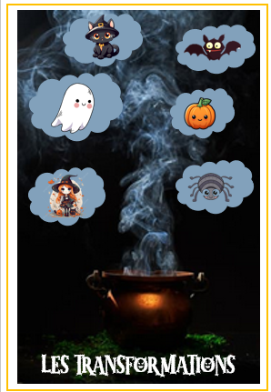 4- De retour chez la sorcière je donne mes ingrédients: elle les place sur le chaudron modèle pour vérifier qu'elle a tout ce qu'il nous faut. si c'est le cas elle prononce la formule magique et me donne le coloriage correspondant à ma transformation.