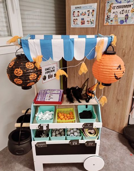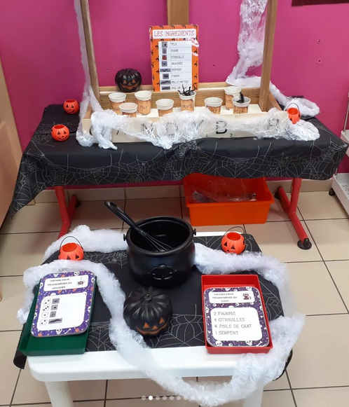 Mais voilà pas forcément le même matériel et surtout une envie de fonctionner un peu différemment. J'avais evie de donner une plus grande finalité que juste ramener son cartable bien rempli ou faire semblant de manger sa glace. je souhaitais retrouver une finalité comme avec l'espace gentillesse ou les lutins de Noël mais pas en langage écrit en restant plus accès sur les maths. je me suis donc dis que j'allais utiliser les deux espaces de ma classe pour n'en faire qu'un seul. D'un côté la sorcière qui portera donc un chapeau et qui donnera la liste des courses selon en quoi on veut être transformer, d'un autre côté l'alchimiste qui vendra les divers objets, et au milieu le petit humain qui veut se transformer.