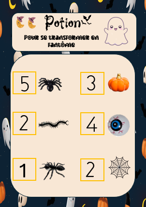 Les cartes de jeux: il y a deux niveaux ( marqués par la quantité de lune d'halloween), pour les PS il y a 1-2 objets de plusieurs sortes à récupérer, pour les GS les 6 sortes d'objets dans des quantités entre 1 et 6. il y a dans le même document les chaudrons solutions.