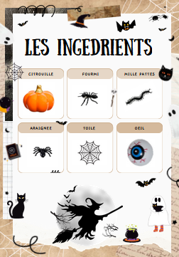 2. La sorcière me donne la liste des ingrédients. Pendant que je vais faire les courses elle prépare le chaudron solution et trouve combien je dois acheter d'ingrédients de chaque sorte ( pour les GS, si la sorcière est un PS on sort juste le chaudron modèle et on prépare le coloriage).